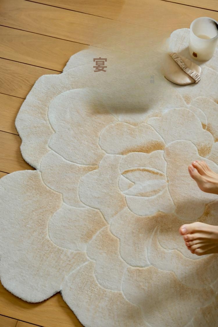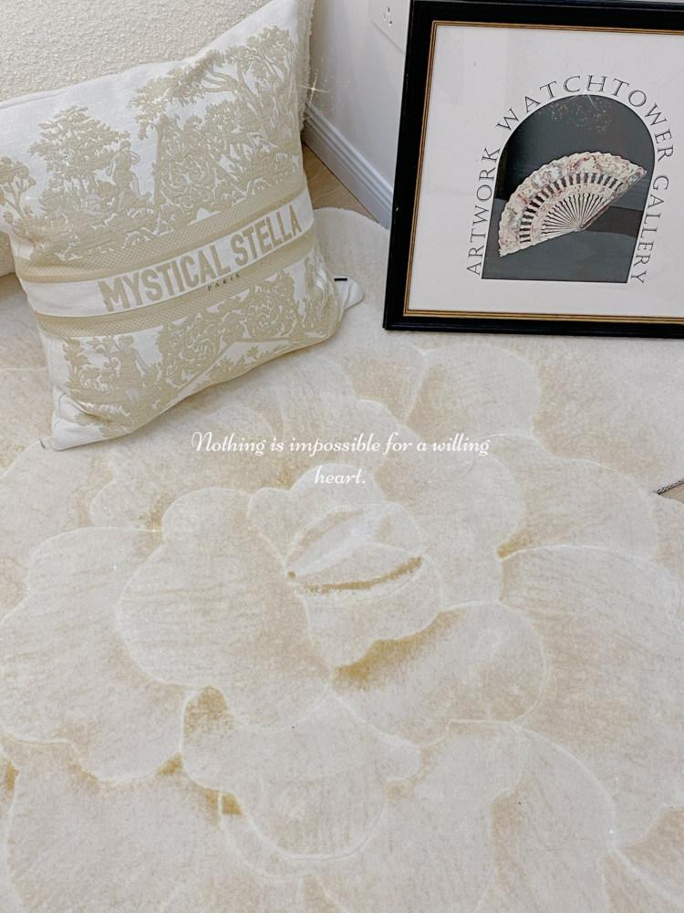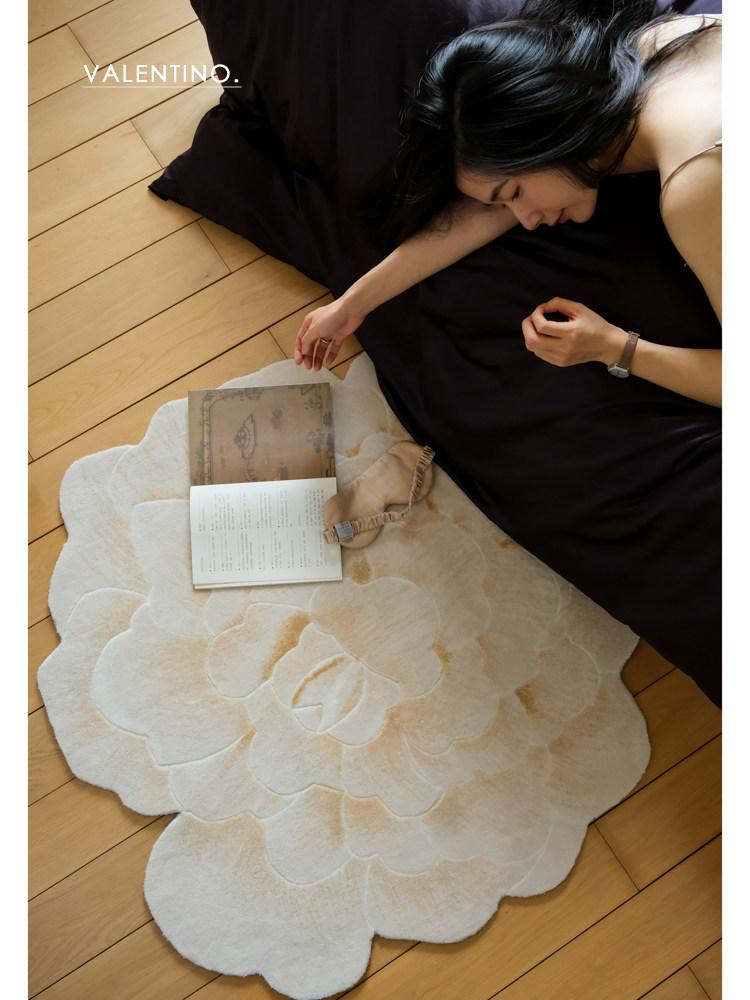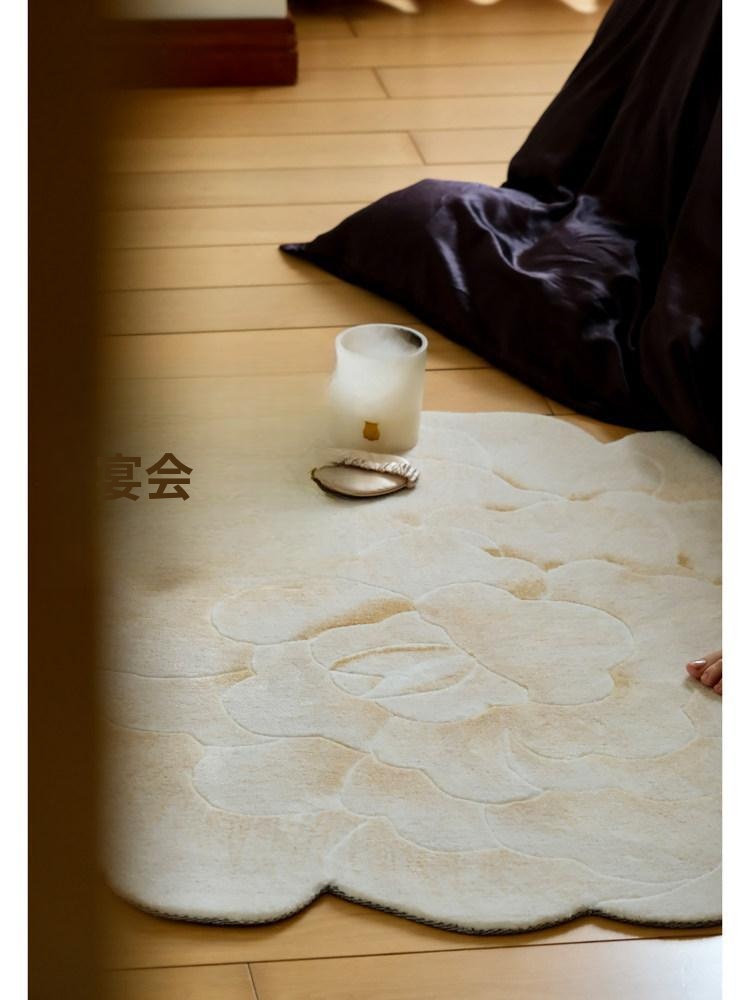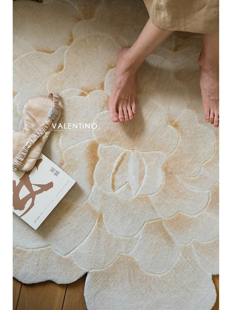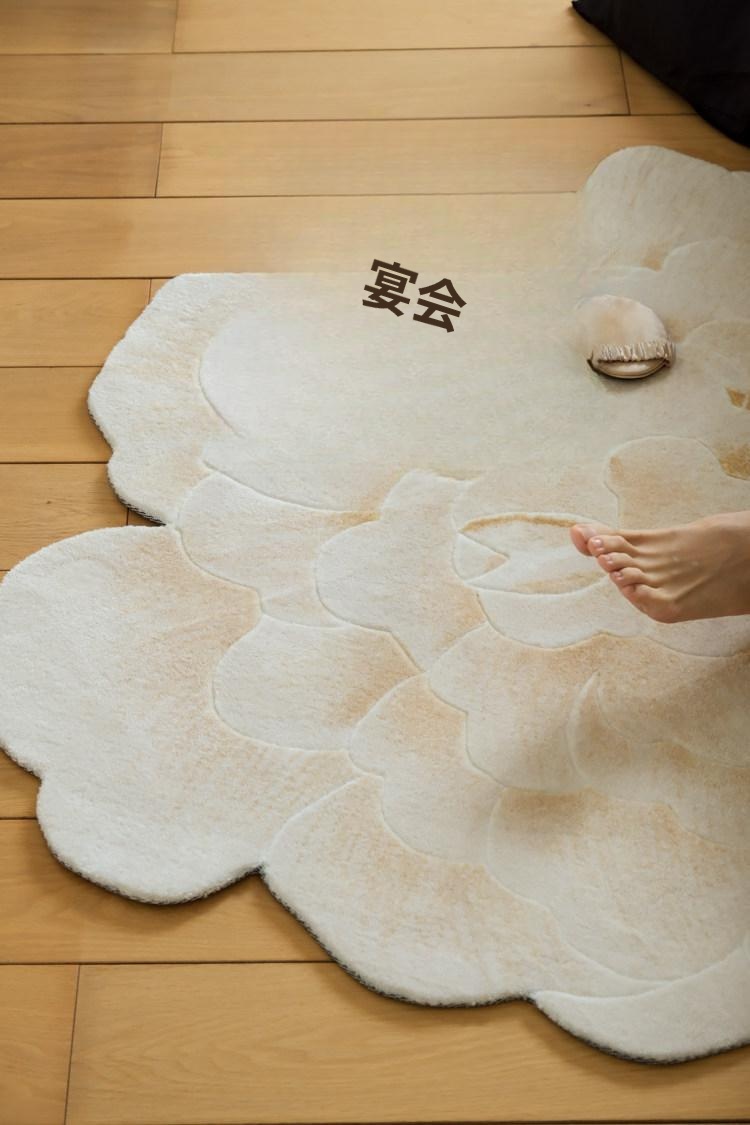 若奈 V*lentino「金絲白牡丹」立体手雕ベッドサイドマット・玄関マット・鏡前ミニカーペット - 高級感あふれるデザインで、あなたの空間に優雅さをプラス!