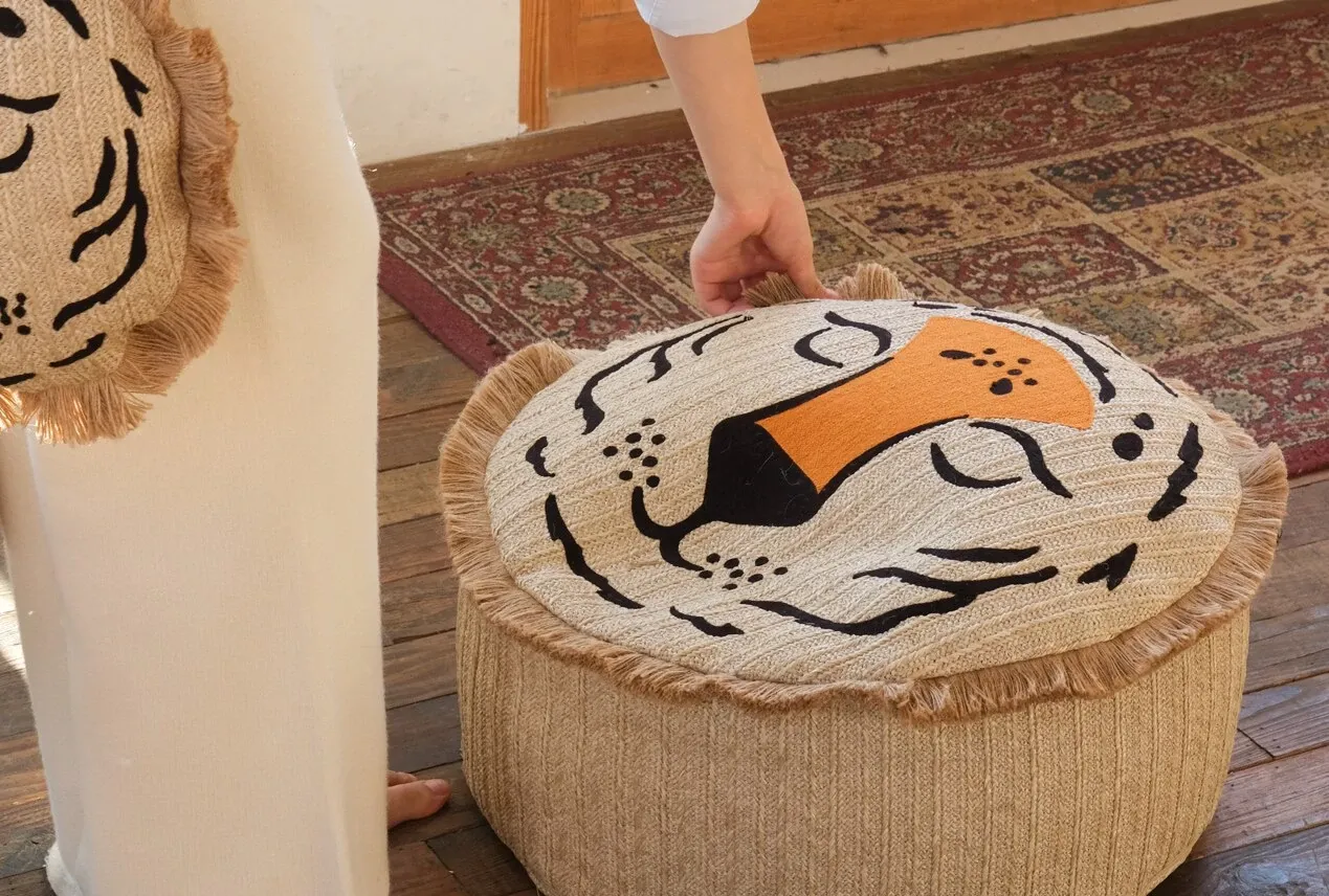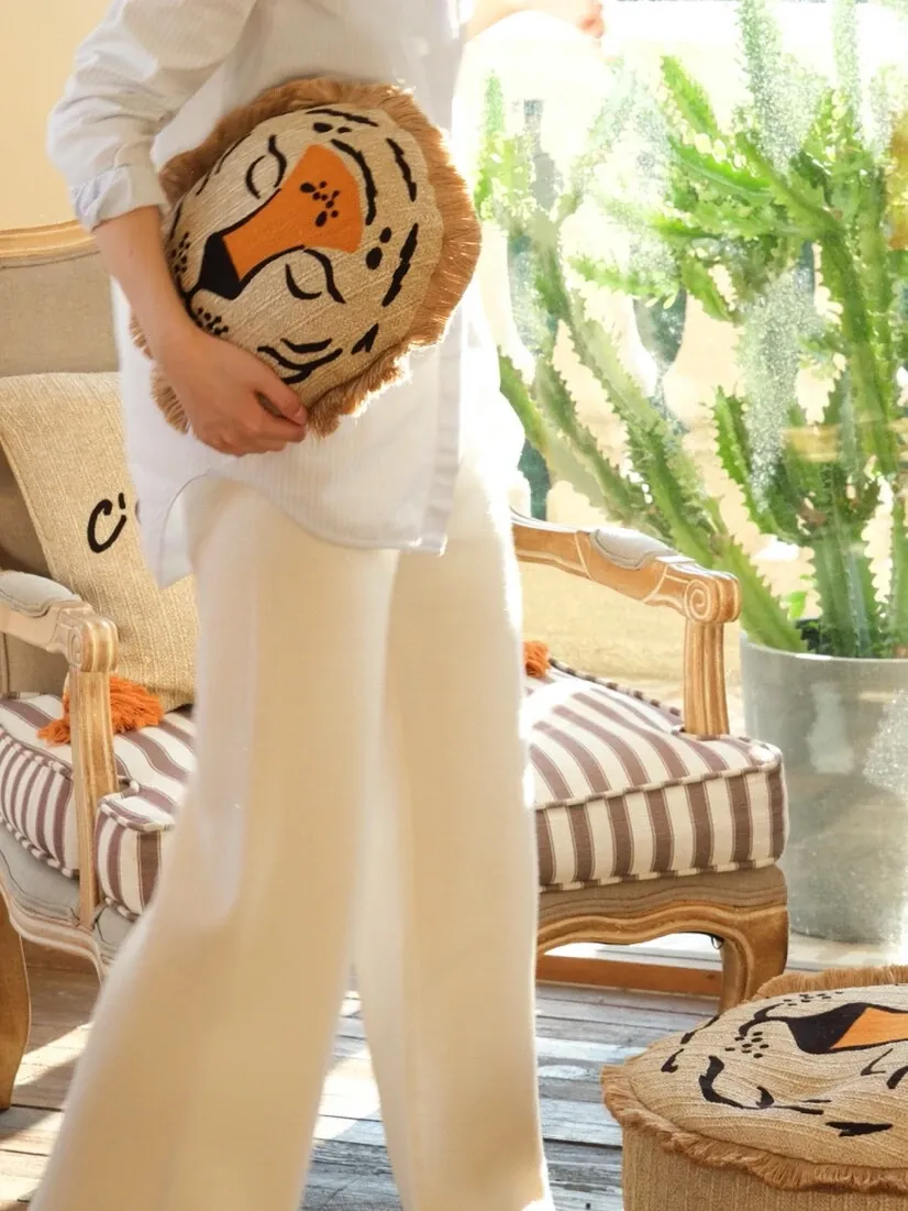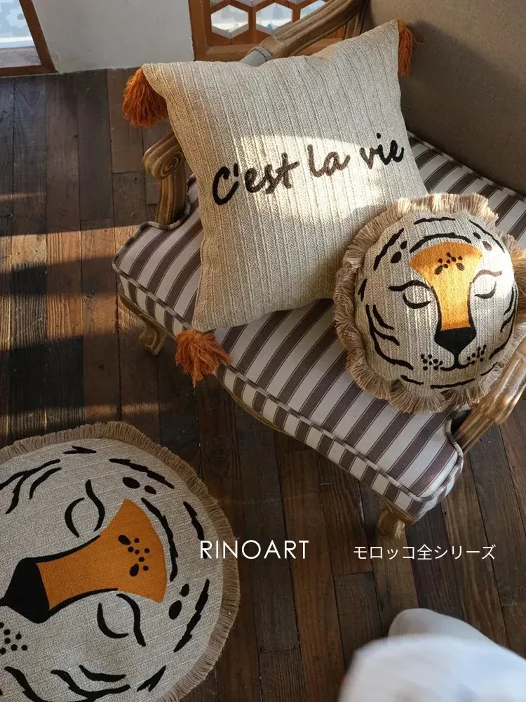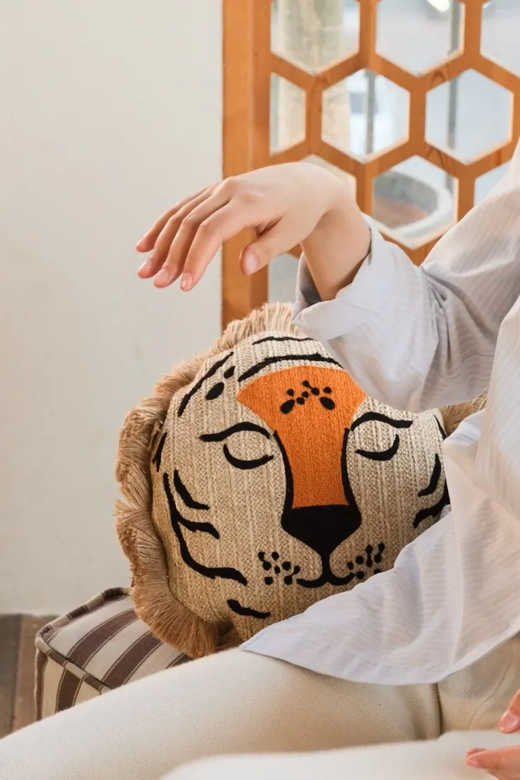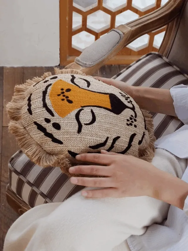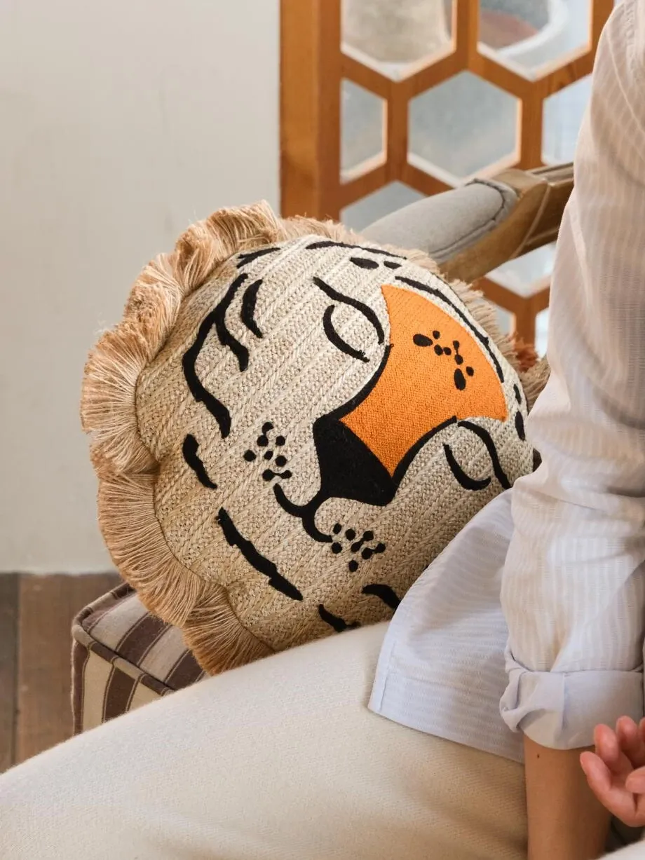 若奈 モロッコシリーズの手編み・手刺繍「ライオンキング」小型クッションは、洗濯可能でソファにぴったり!華やかなデザインでお部屋を彩り、リラックスした時間を提供します。