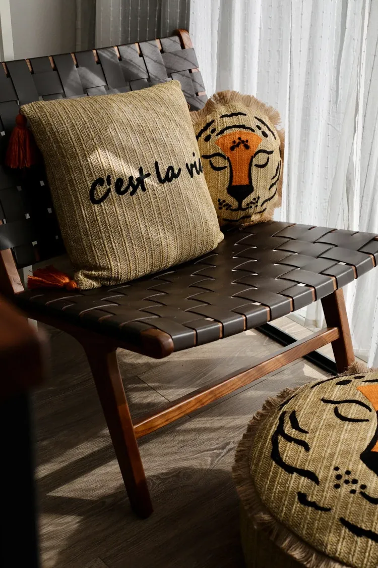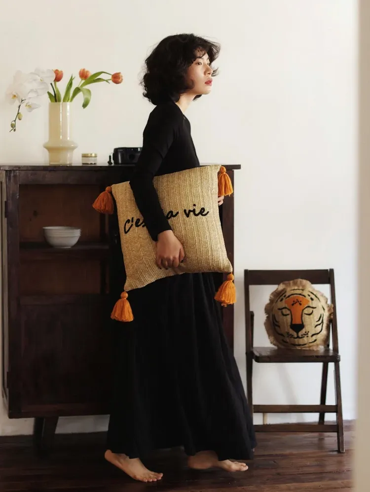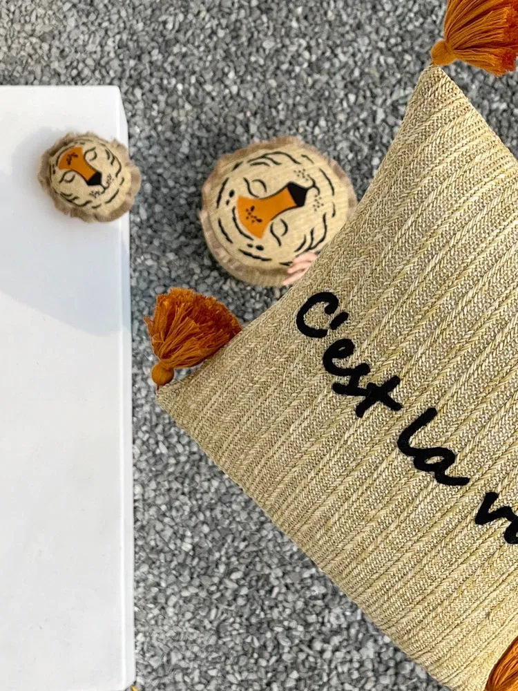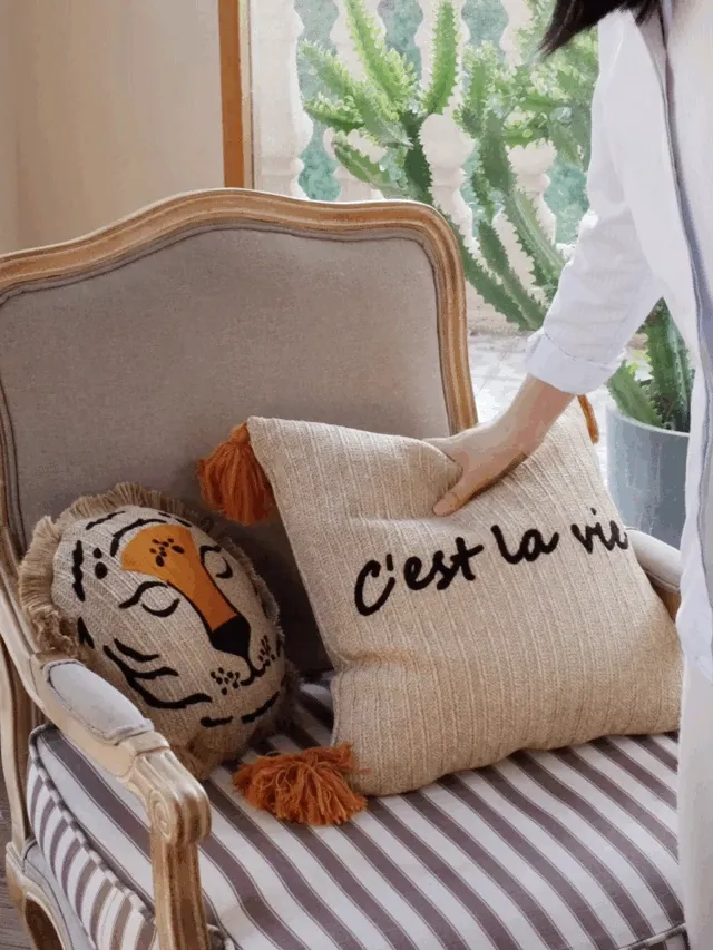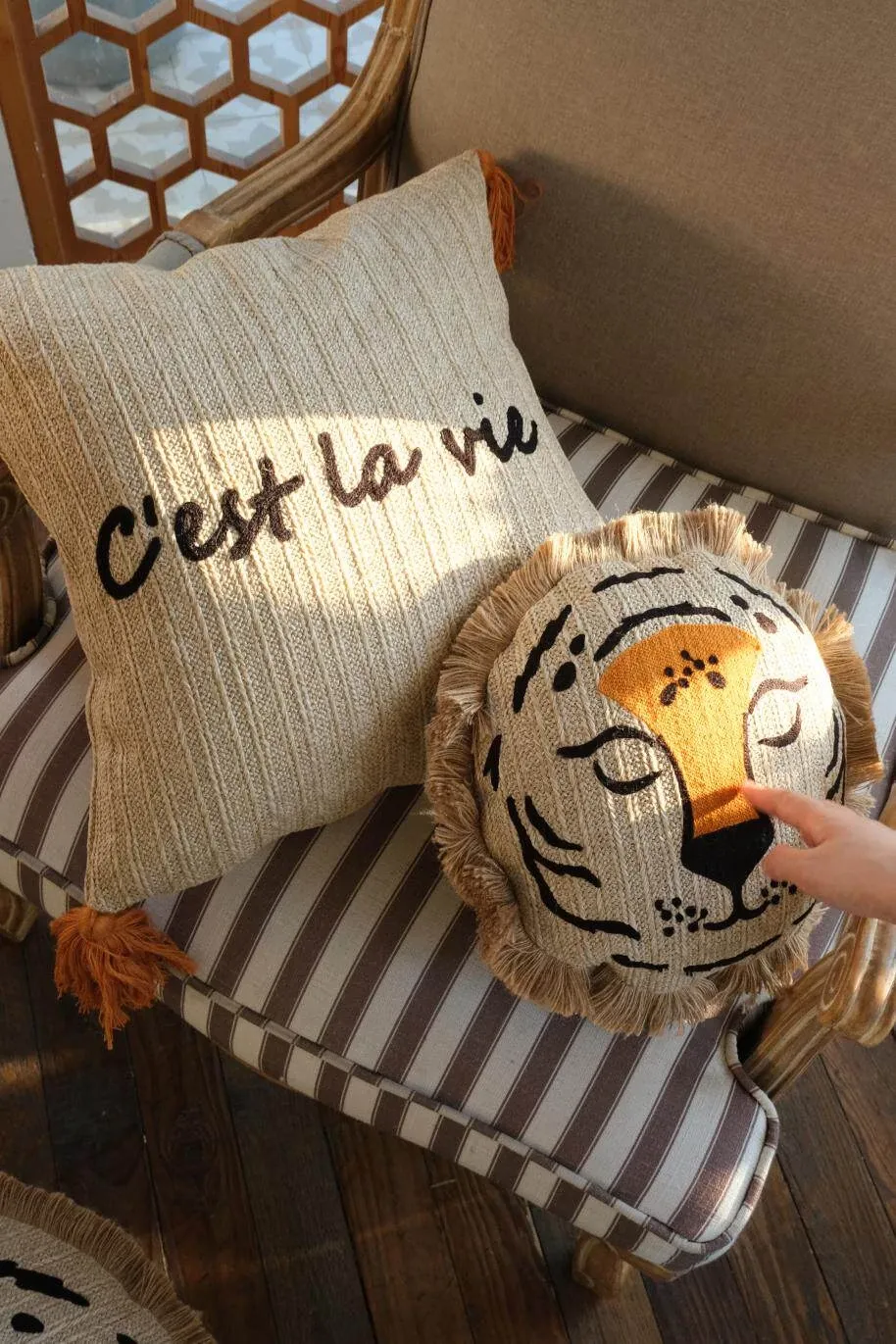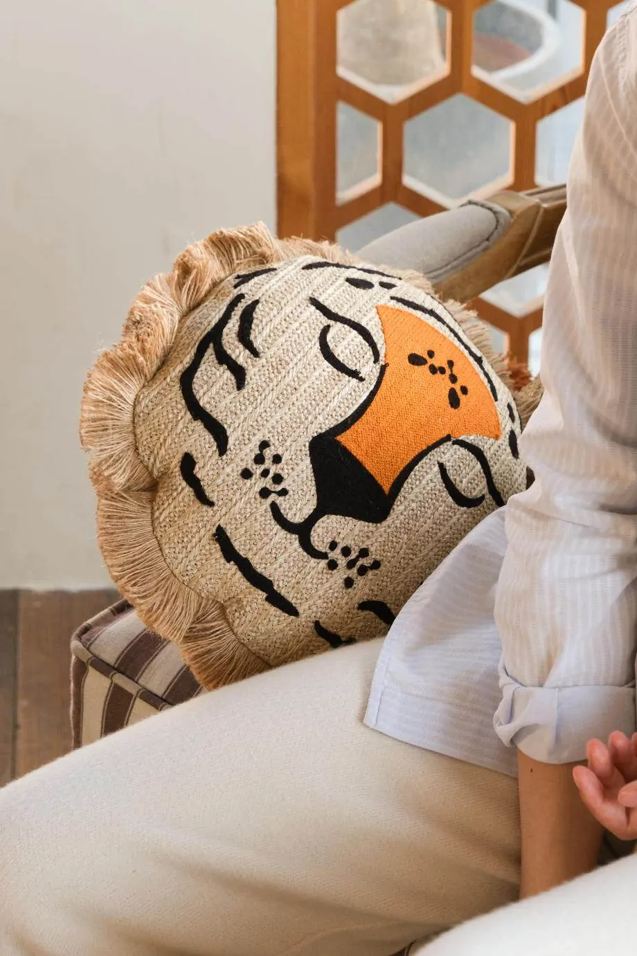 若奈 モロッコシリーズの手編み・手刺繍「ライオンキング」小型クッションは、洗濯可能でソファにぴったり!華やかなデザインでお部屋を彩り、リラックスした時間を提供します。