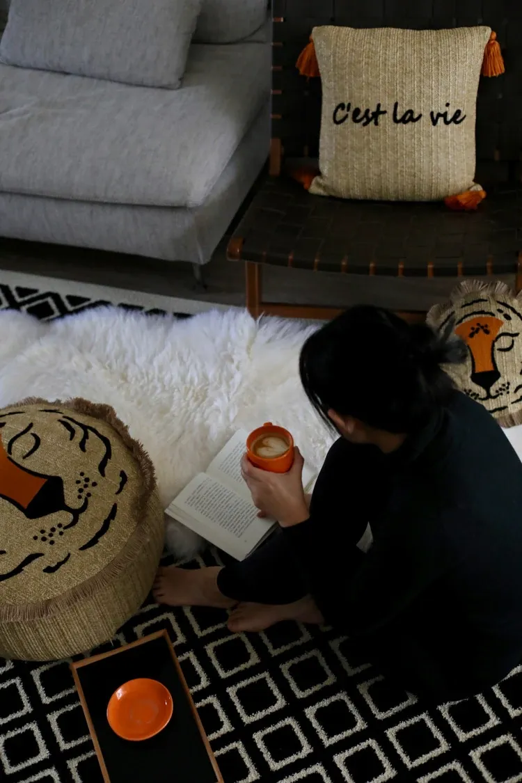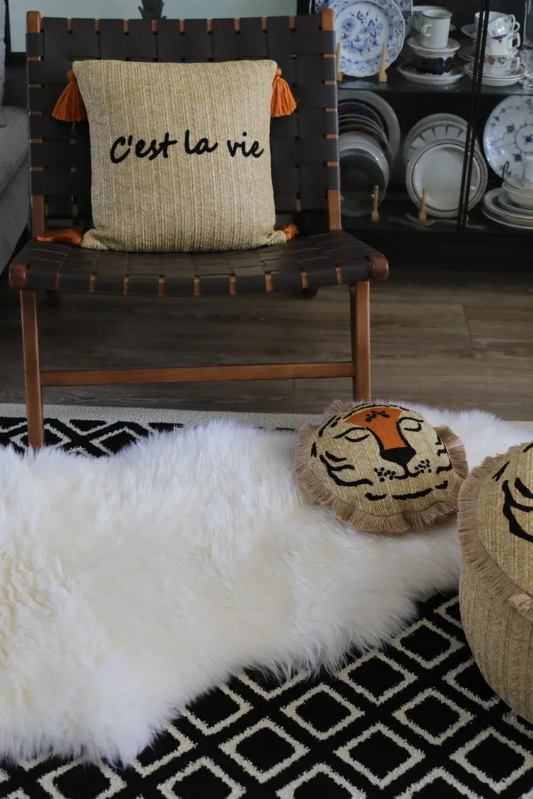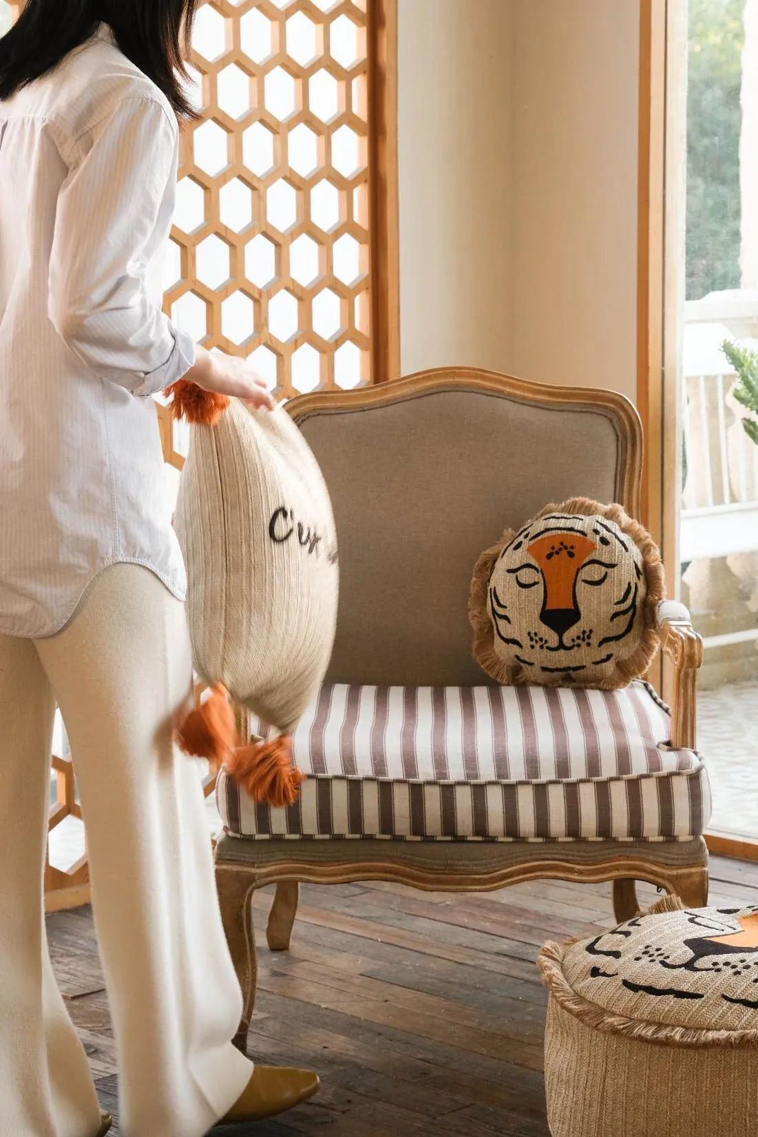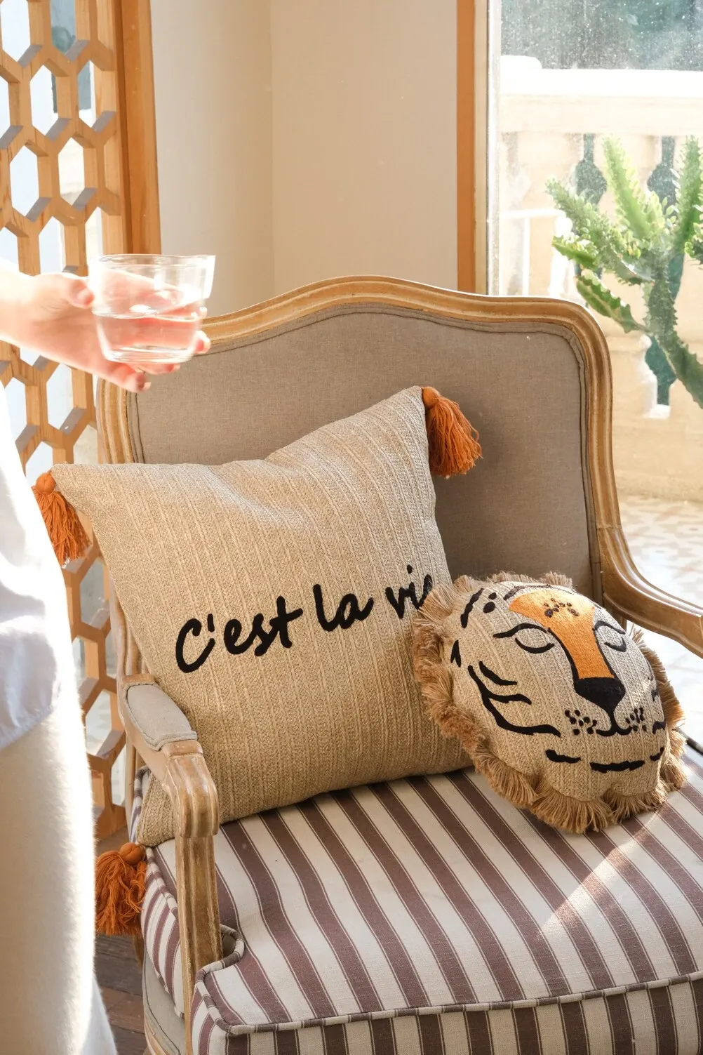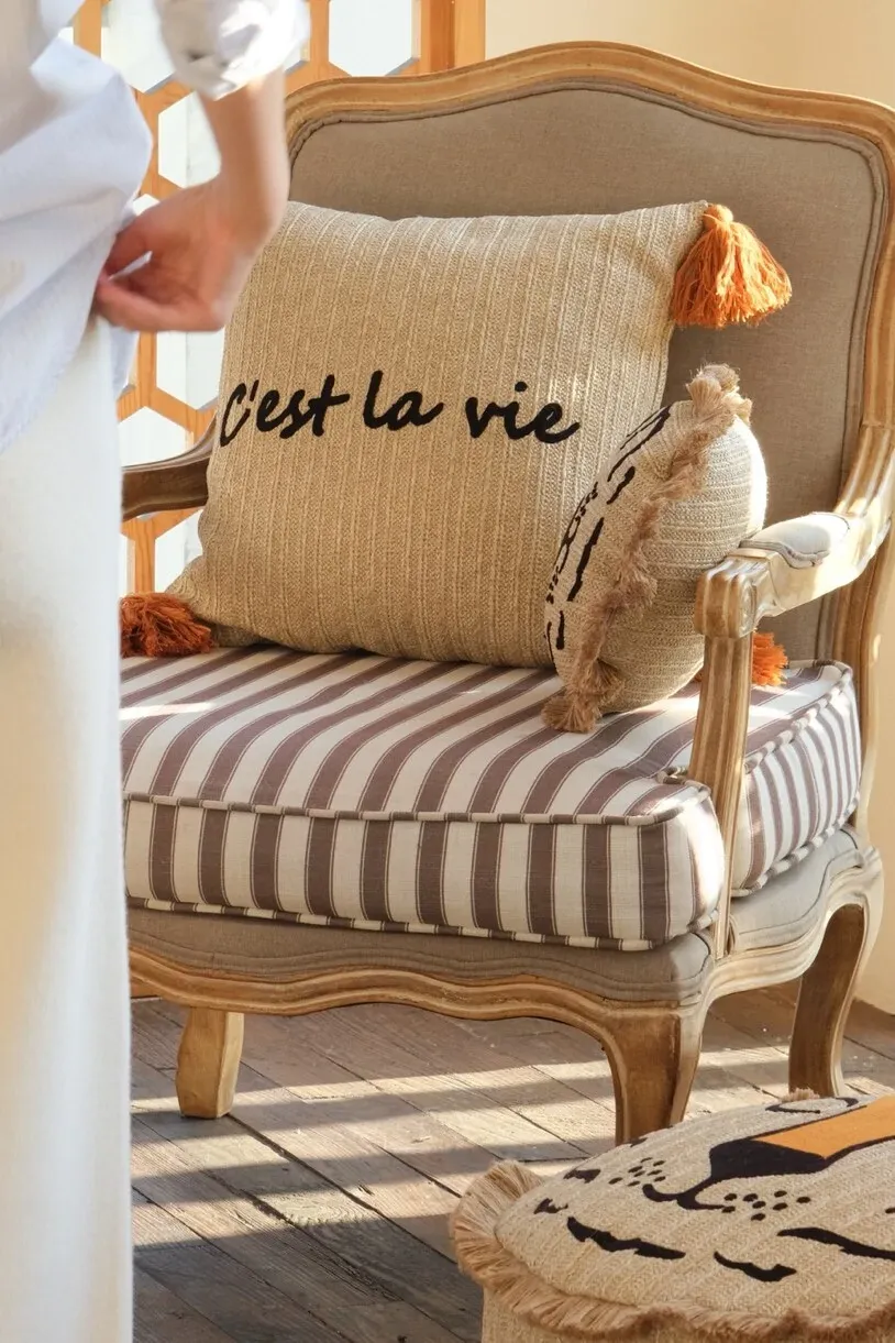 若奈 モロッコシリーズの手編み・手刺繍「ライオンキング」小型クッションは、洗濯可能でソファにぴったり!華やかなデザインでお部屋を彩り、リラックスした時間を提供します。
