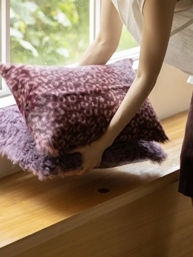 若奈 北米限定新色!天然ソフトゴールドスキン一体型ガロンパープルヒョウ柄ウールクッション・抱き枕で、快適なリラックスタイムをお楽しみください!