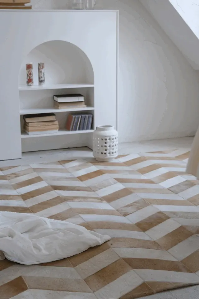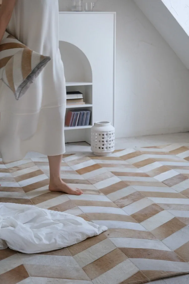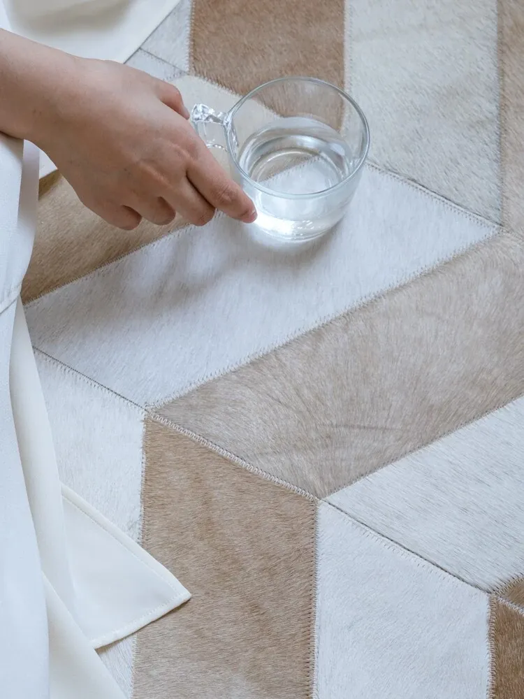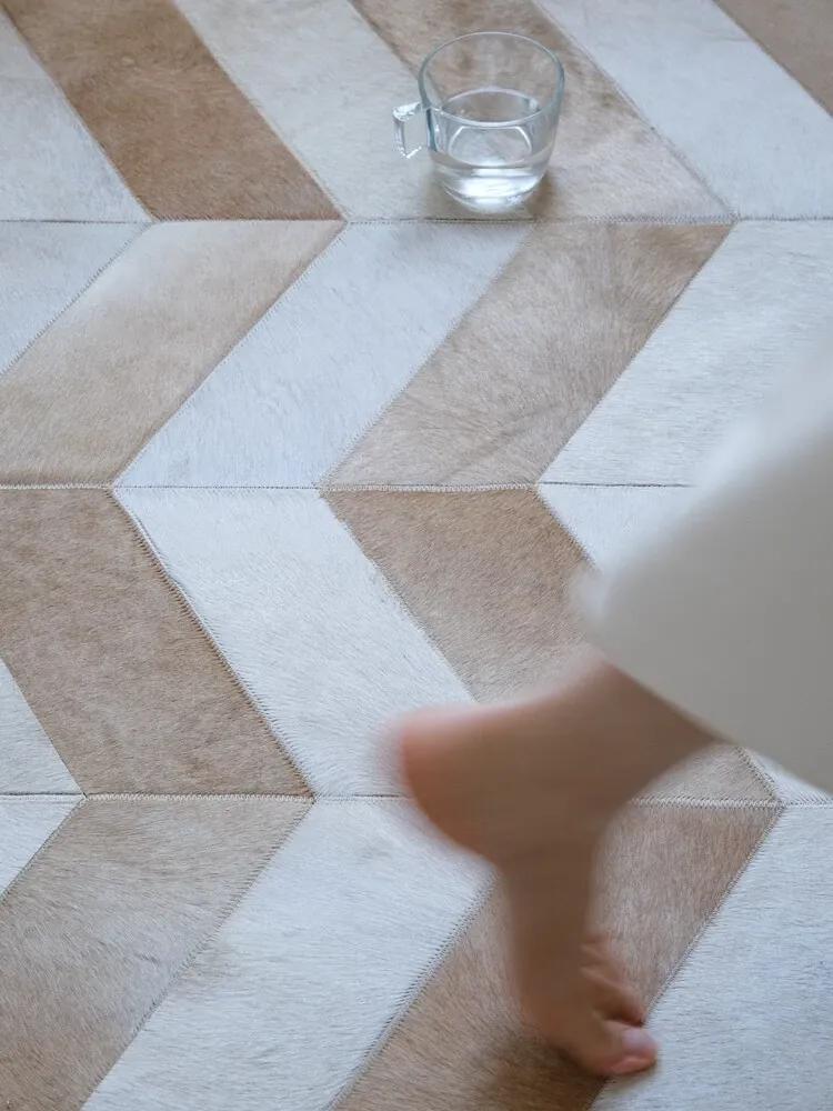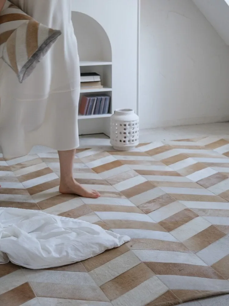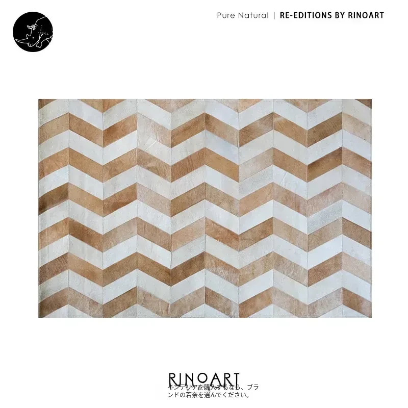若奈 Q1ランクデンマーク牛革使用!フレンチハーストライプデザインのミルクブラウン二色カーペット、リビングや寝室に最適で、優雅な空間を演出します。