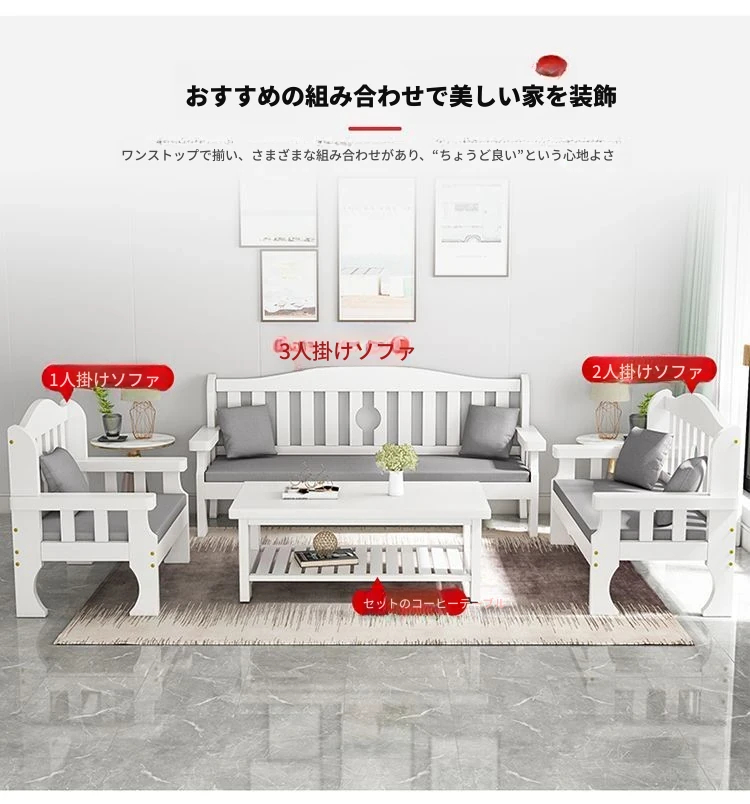 【おすすめセット】シングル+ダブル+スリー+コーヒーテーブル/環境保護ホワイト塗装色【クッション+抱き枕+組み立て工具付き】