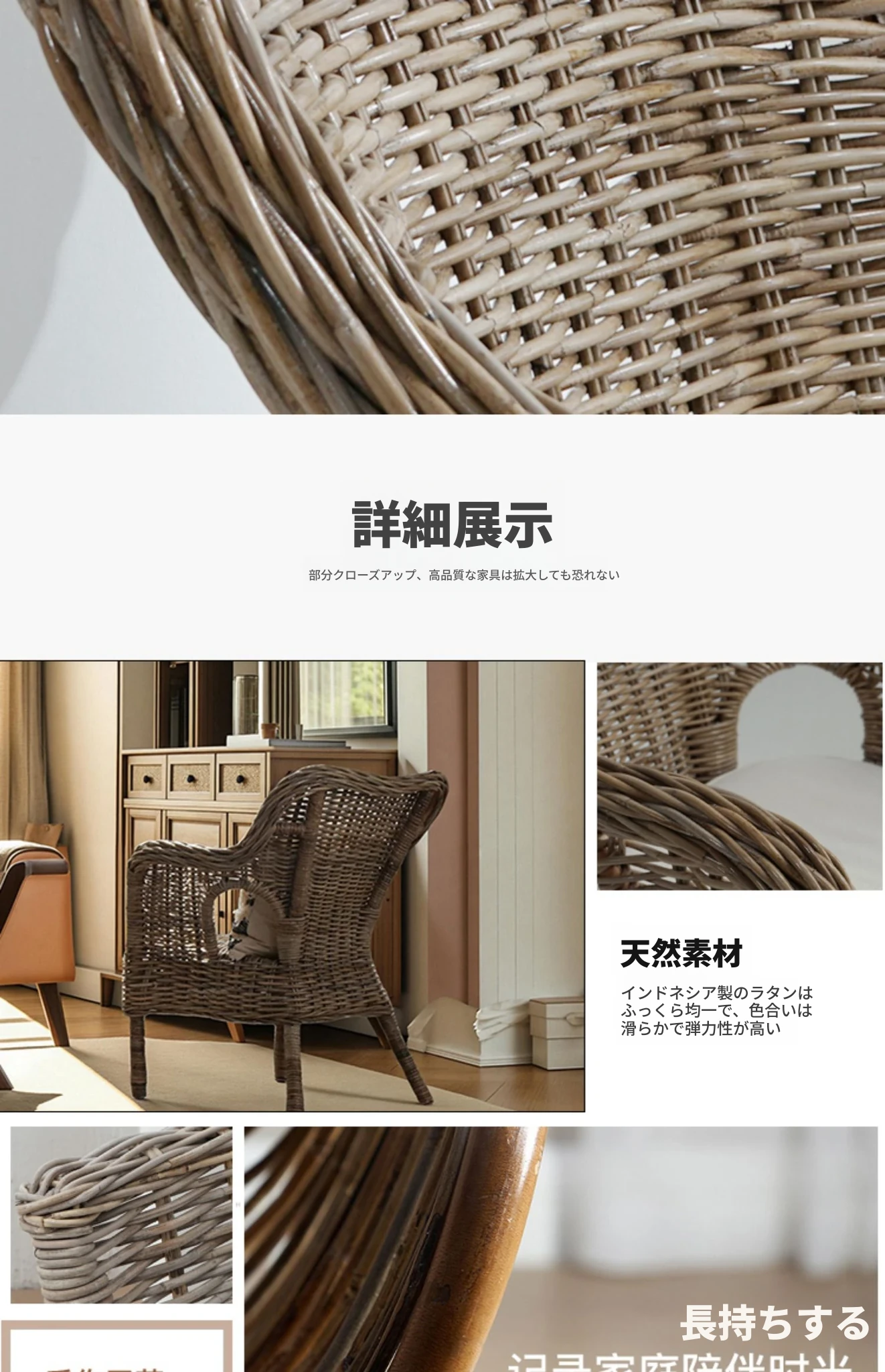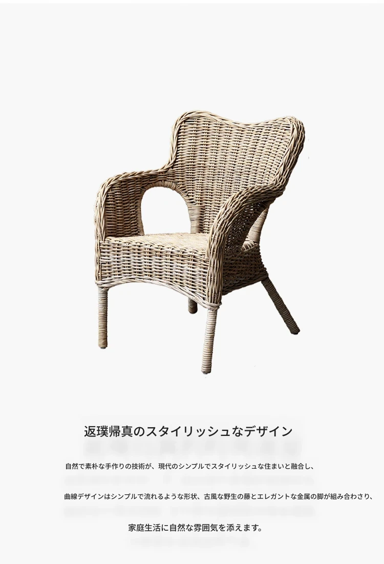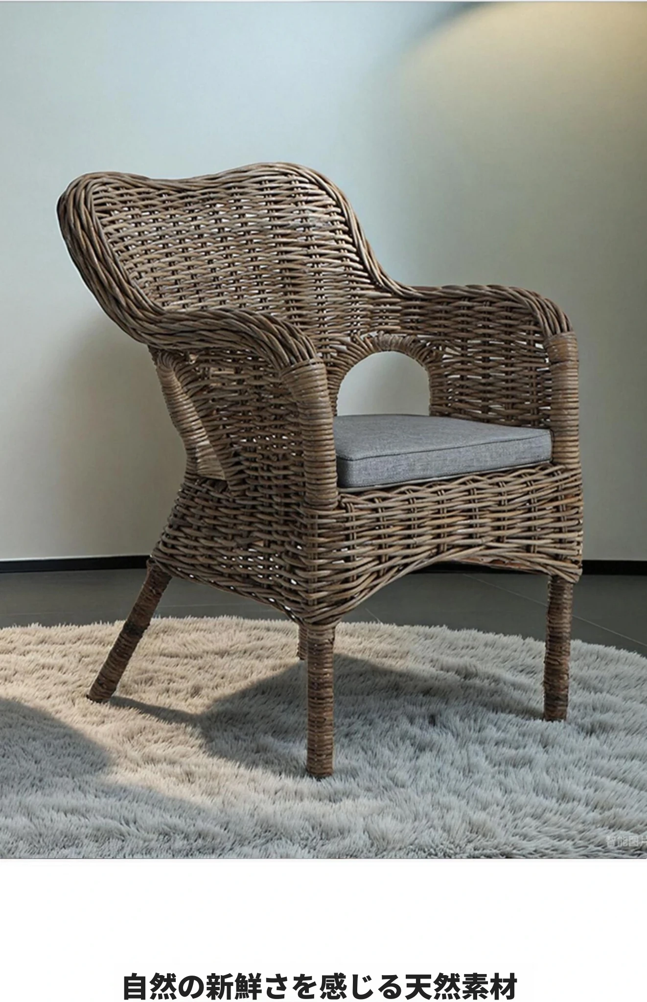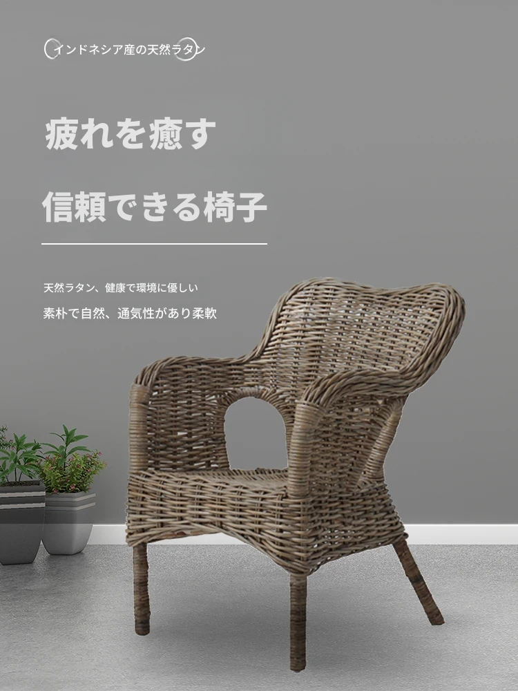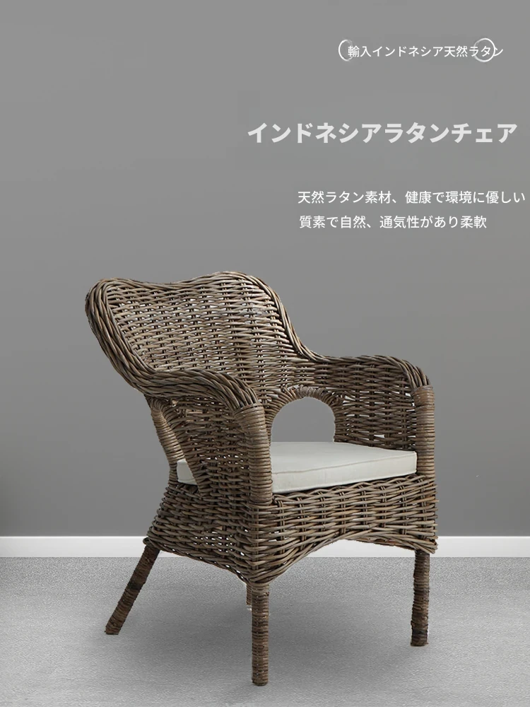 スローライフ東南アジア風 インドネシア製ラタン編み一人掛け椅子 ガーデン用侘寂スタイル 中古の天然フレンチアウトドアラタンチェアで、心地よいひとときを楽しもう!