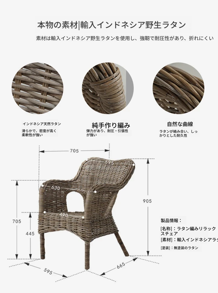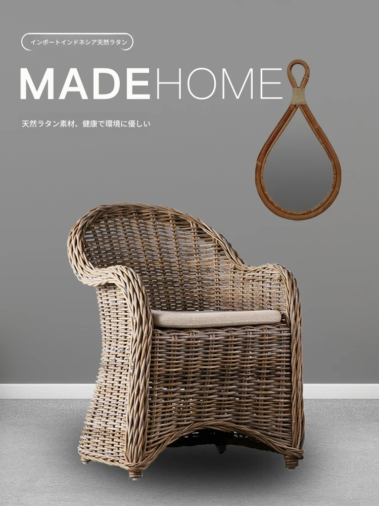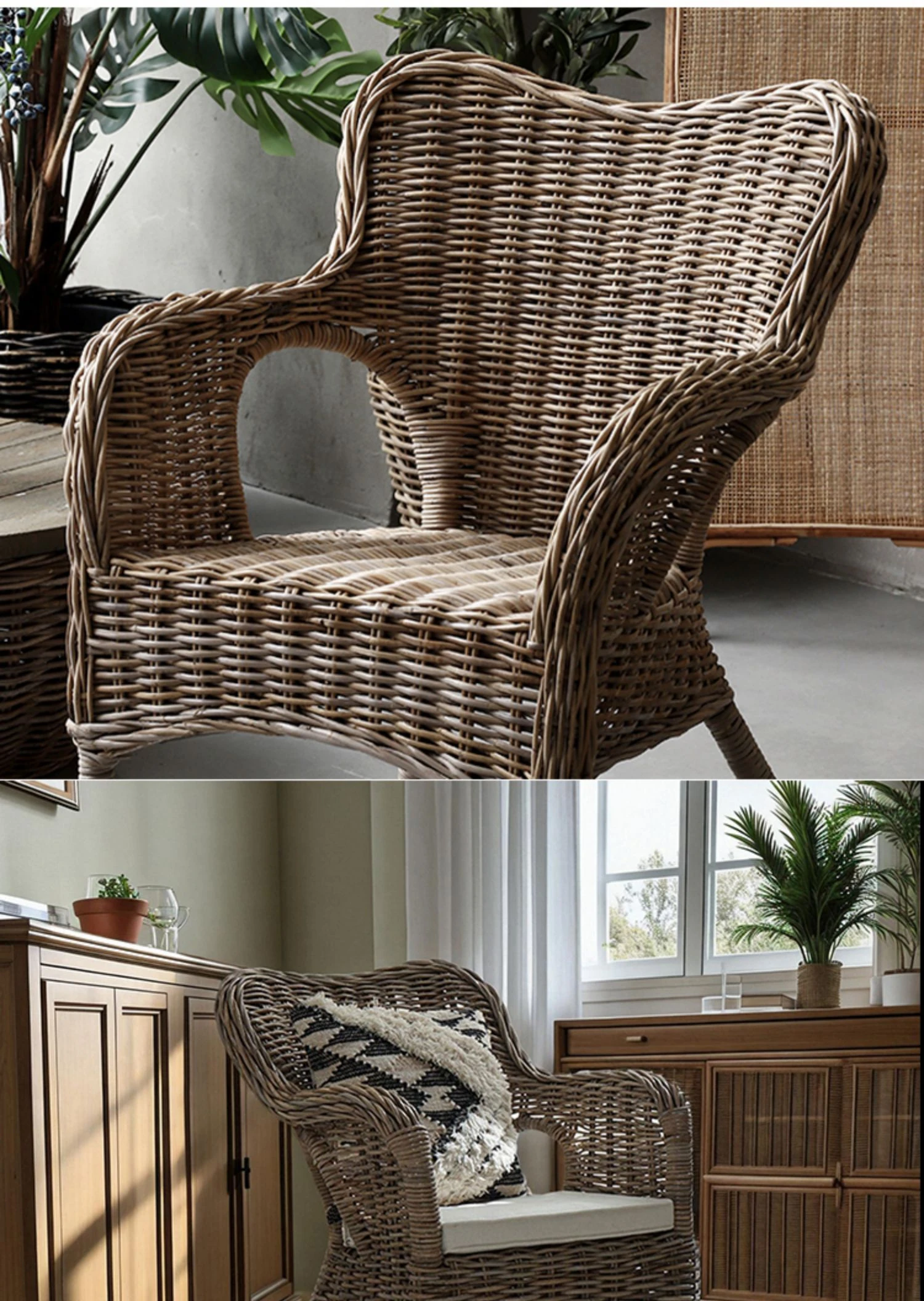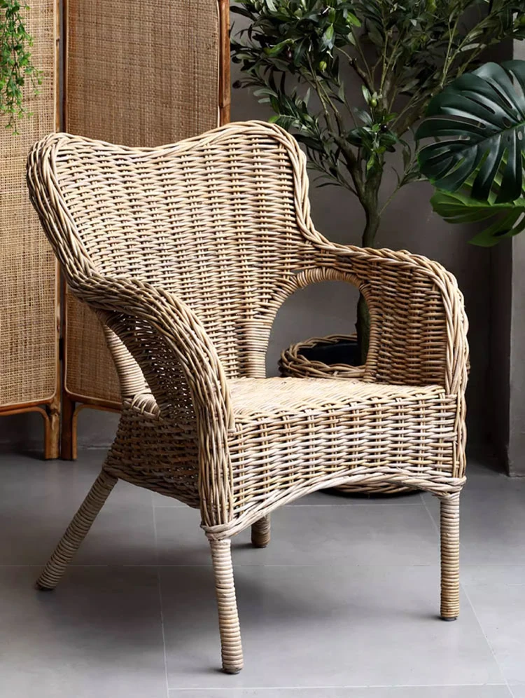 スローライフ東南アジア風 インドネシア製ラタン編み一人掛け椅子 ガーデン用侘寂スタイル 中古の天然フレンチアウトドアラタンチェアで、心地よいひとときを楽しもう!