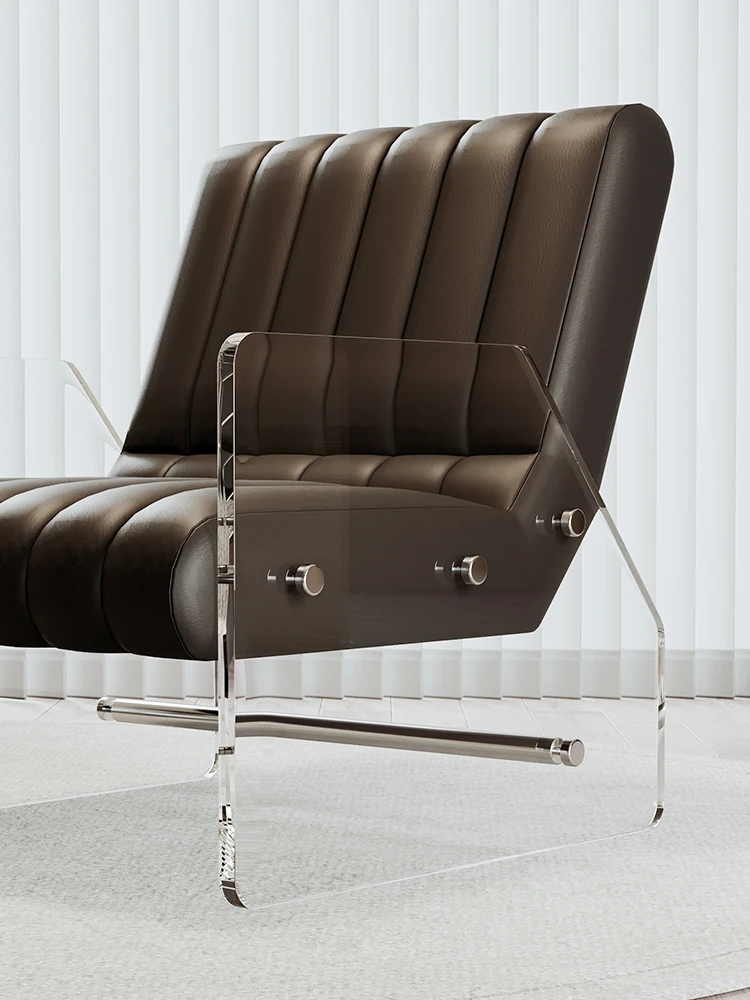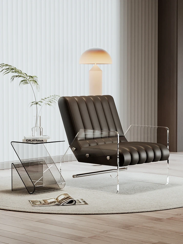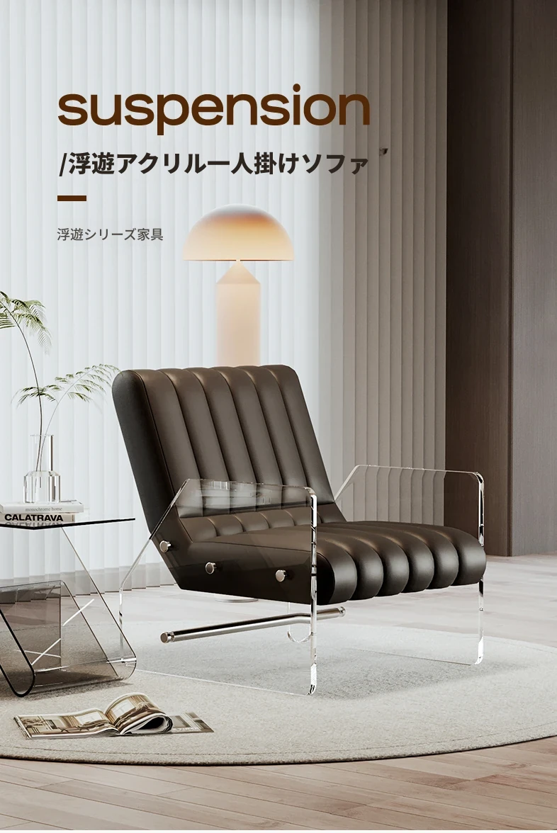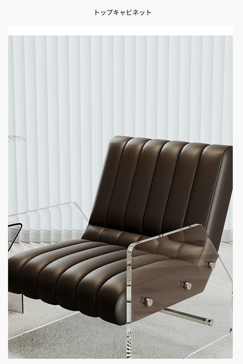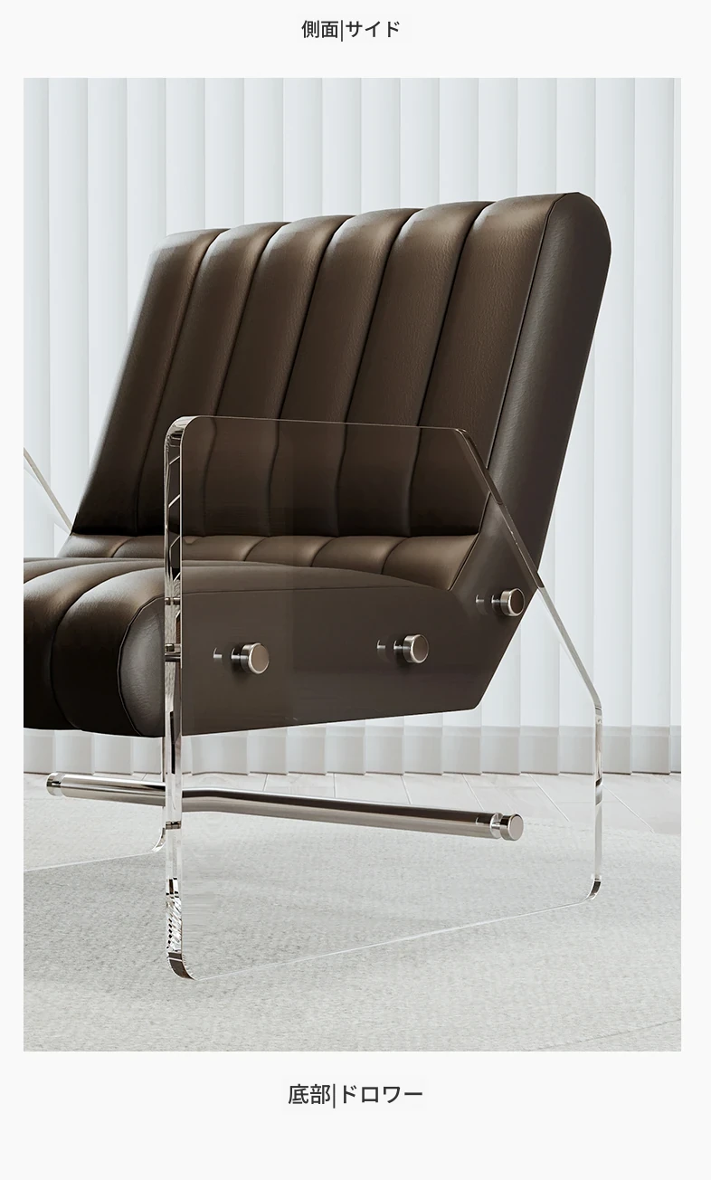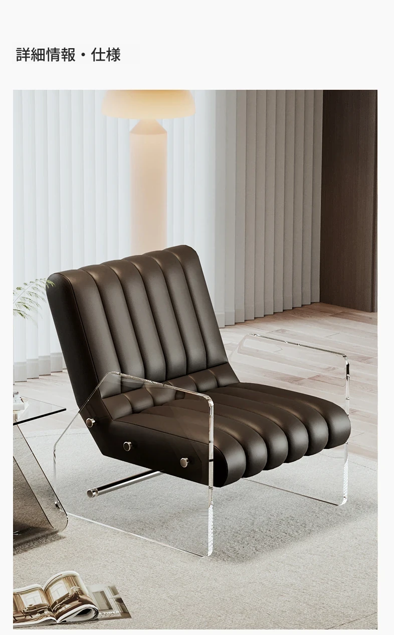 浮遊感のある透明アクリル製シングルソファ、寝室やリビングに最適な高級レザー使用のデザイナーリクライニングチェア。ラグジュアリーなひとときを演出する、軽やかな休息空間を提供します。