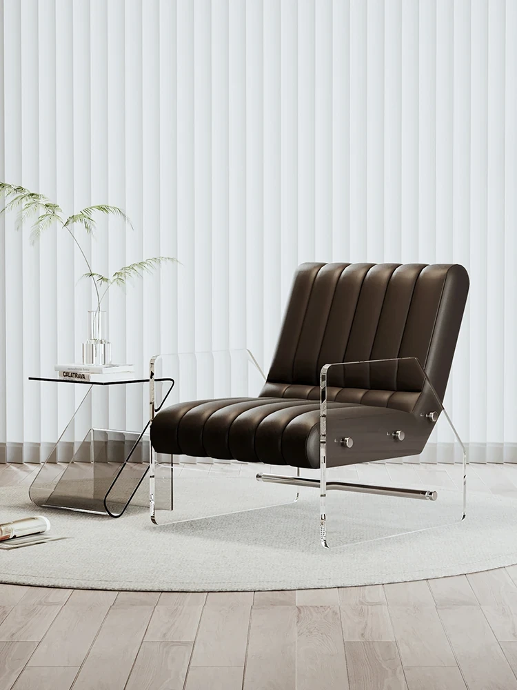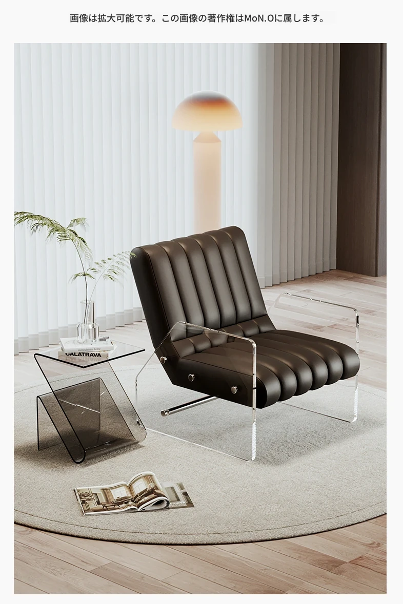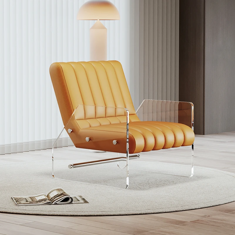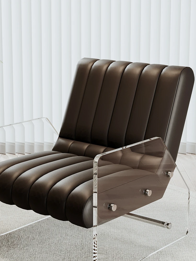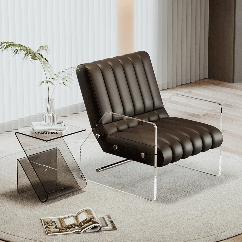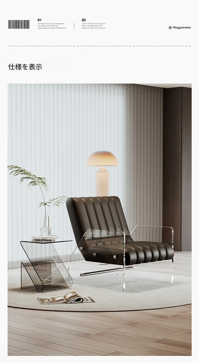 浮遊感のある透明アクリル製シングルソファ、寝室やリビングに最適な高級レザー使用のデザイナーリクライニングチェア。ラグジュアリーなひとときを演出する、軽やかな休息空間を提供します。
