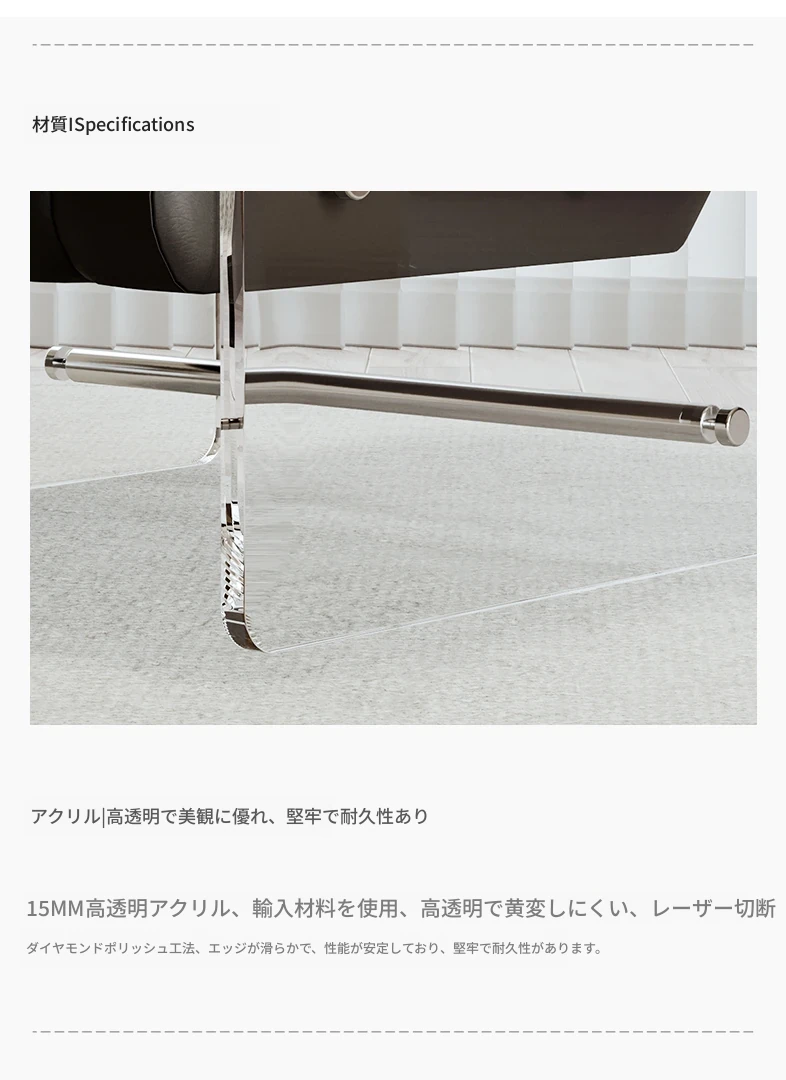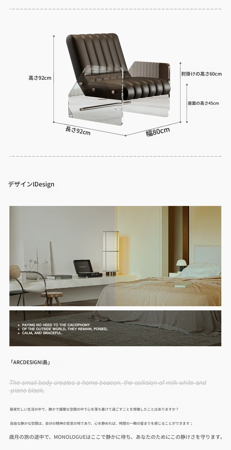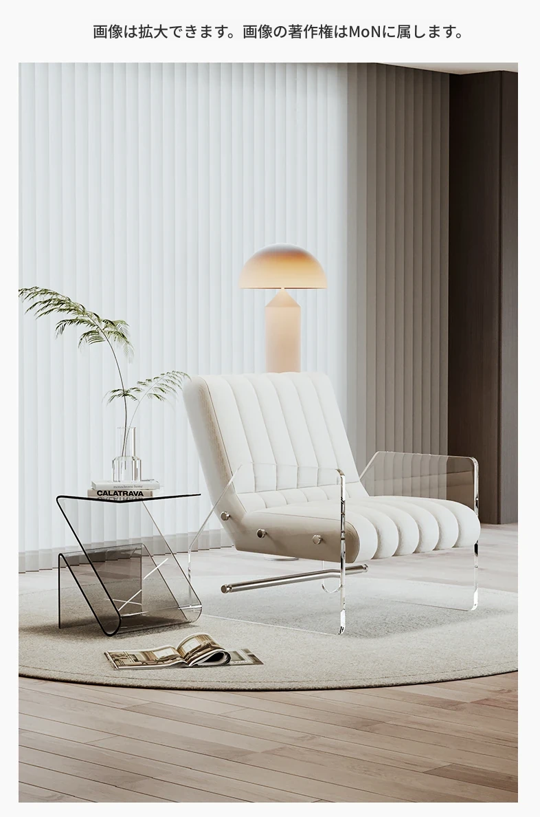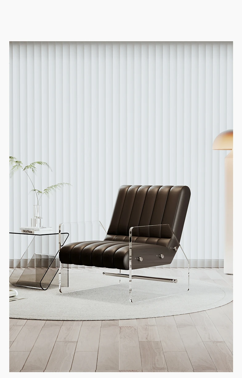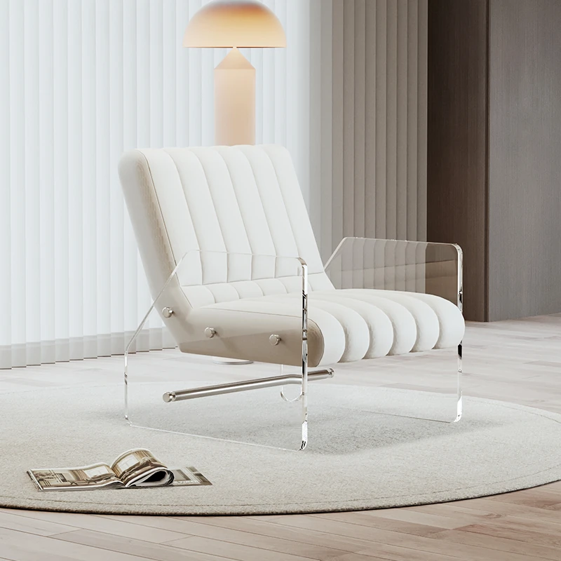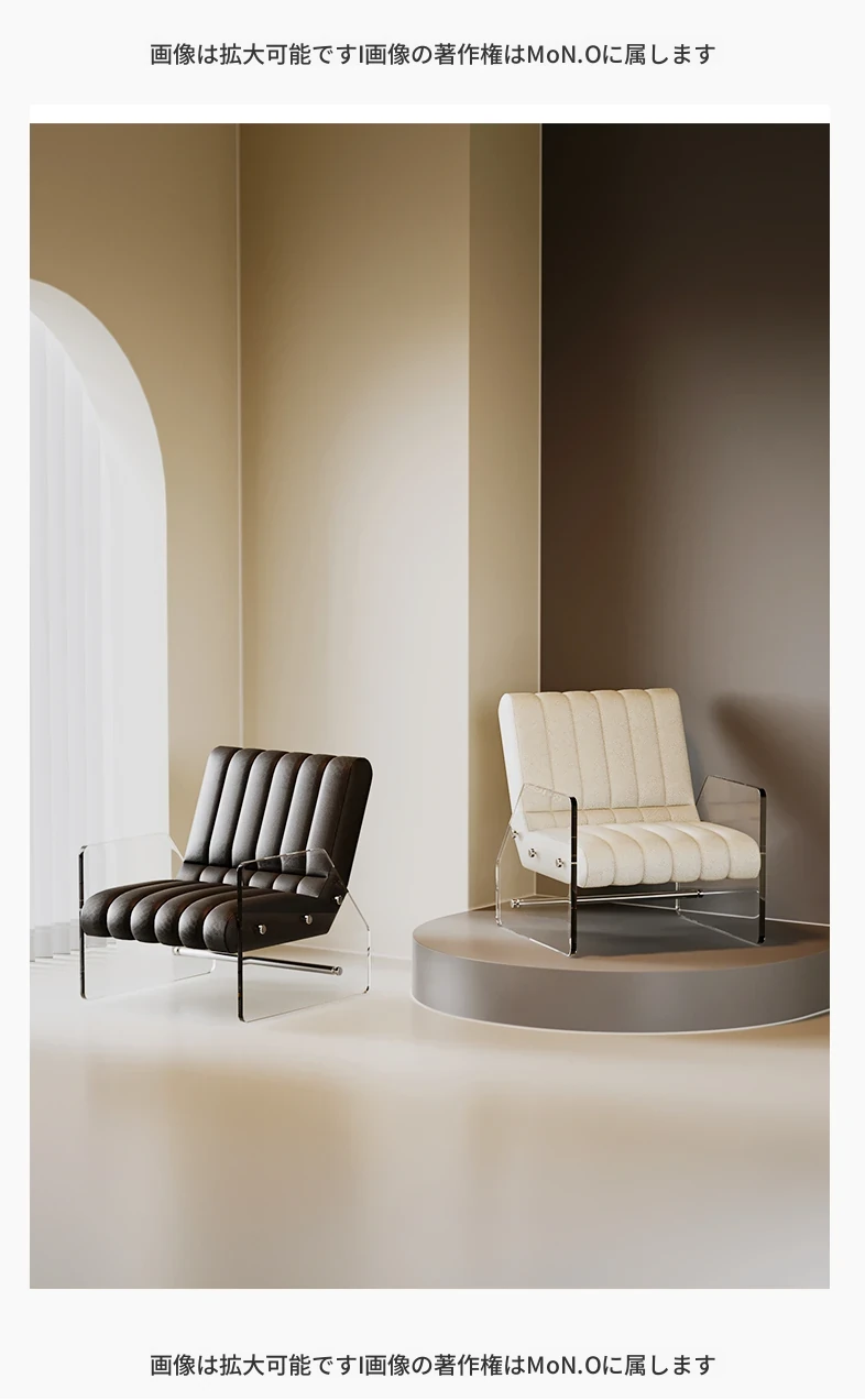 浮遊感のある透明アクリル製シングルソファ、寝室やリビングに最適な高級レザー使用のデザイナーリクライニングチェア。ラグジュアリーなひとときを演出する、軽やかな休息空間を提供します。
