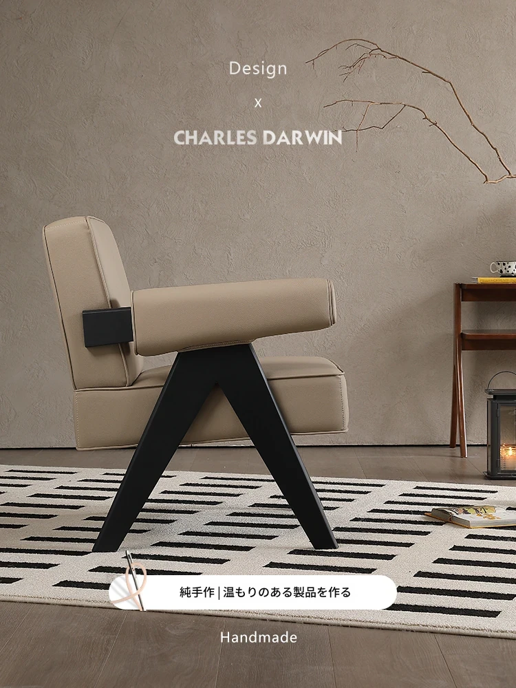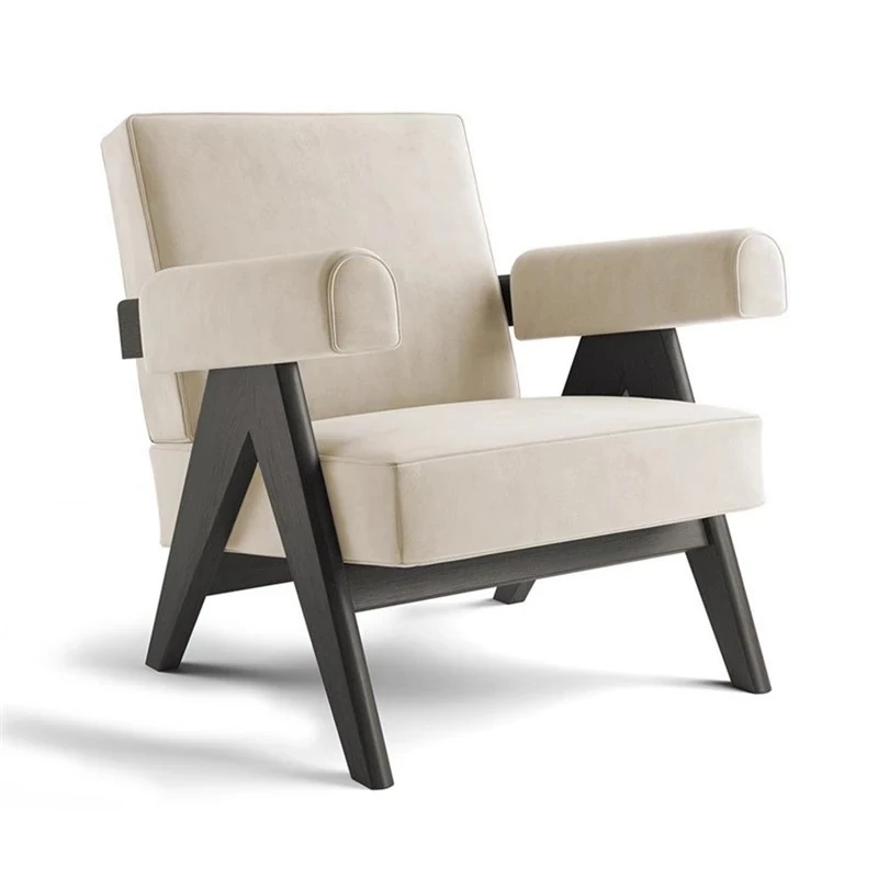 チャンディガールチェア レトロな無垢材の1人掛けファブリック&レザーリクライニングチェア - リビングルームにぴったりの侘び寂びスタイル、別荘にも最適なアームソファ。心地よいくつろぎを提供します!