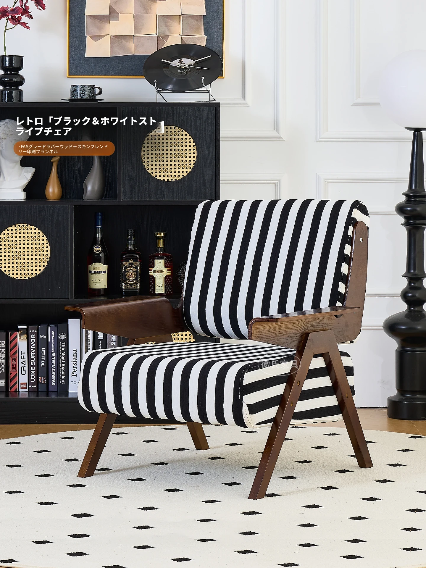 一人用レトロデザインの木製ソファチェア - リビングや寝室に最適!快適な背もたれ付き、デザイナーのこだわりが詰まった休息スペースを演出。バルコニーにもぴったりなスタイリッシュな一脚です。