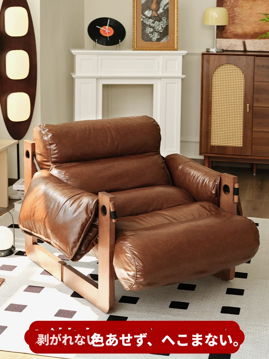 ヴィンテージ風ジャージー島チェア リラックスチェア バルコニー用シングルソファ 快適なリクライニング リビングルームに最適な実木製・本革使用 寝転がってくつろげる!