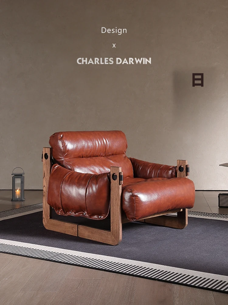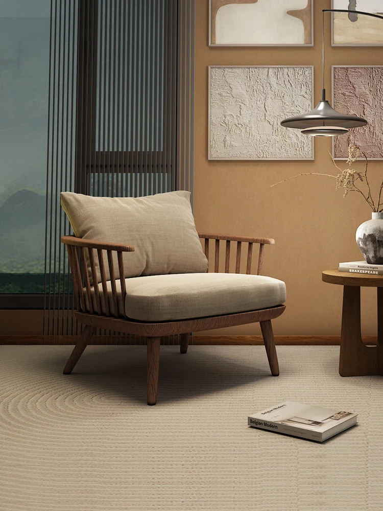 モダンミニマリストの無垢材製シングルソファチェア - アンティーク風のリビングルーム・バルコニー用リラックスチェア。ホテルや民宿の接客にも最適!おしゃれで機能的なデザインで、居心地の良い空間を演出します。