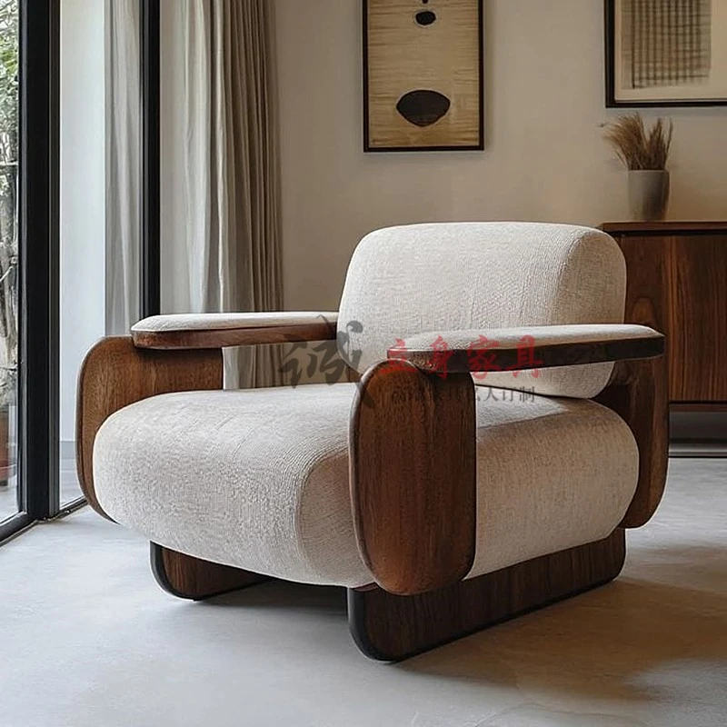 イタリアンミニマリズムの無垢材一人掛けソファ、布製リラックスチェア。デザイナーズ民宿や接客に最適!ショールームや展示会の商談にもぴったりなスタイリッシュな一品。