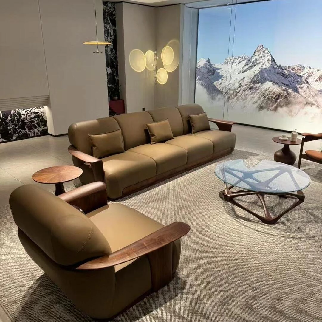2025年新款リビング用ソファ!高級感漂う新中式デザイン、軽やかなラグジュアリー。ウォールナット材とレザーを使用した3人掛けソファで、別荘のような贅沢な空間を演出します。