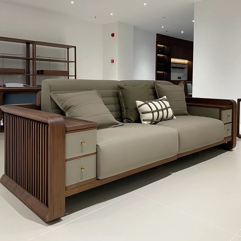 新中式デザインの無垢材リビング用ソファ - ウォールナット材と高級レザーを使用した、どんなサイズの部屋にもフィットするスタイリッシュな大ソファ!快適さと洗練された美しさを兼ね備えた一品です。
