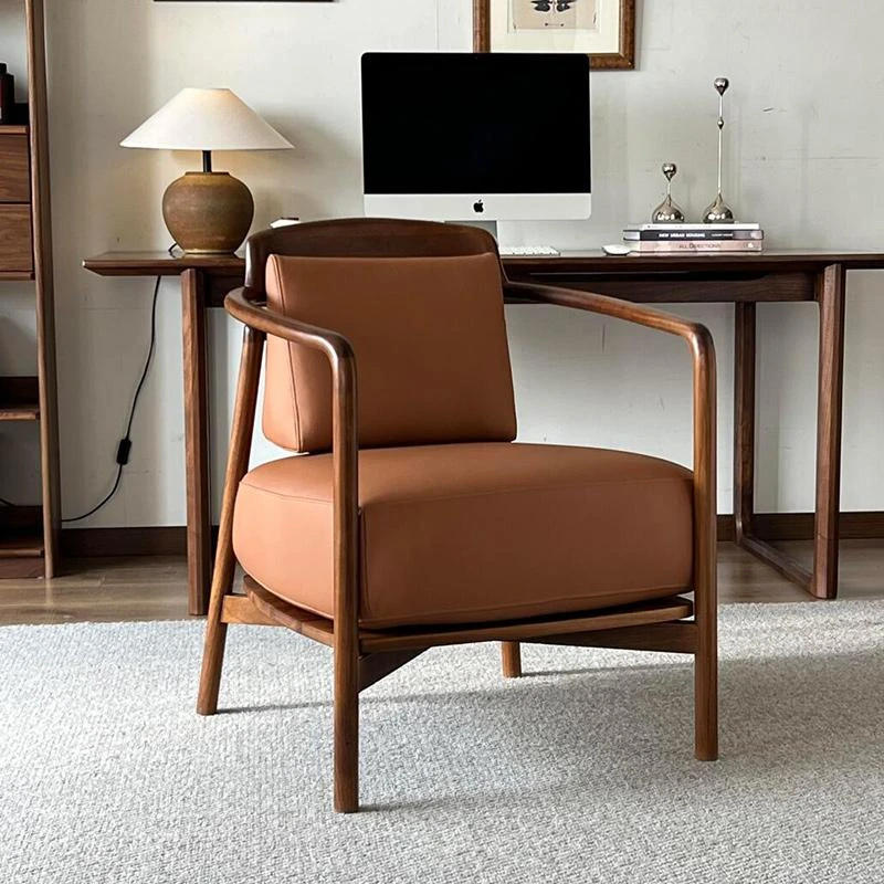 新中式スタイルの無垢材使用!イタリアンミニマルデザインのリラクシングチェア。リビングにぴったりのレザー張りアームソファ。ウォールナット材の優雅さで、心地よいひとときをお楽しみください!