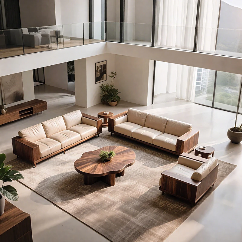 2025年新作!新中式大户型リビングソファー - 高級感溢れる実木とレザー素材使用のヴィラ向けくるみの木ソファーで、居心地の良い接待空間を実現!