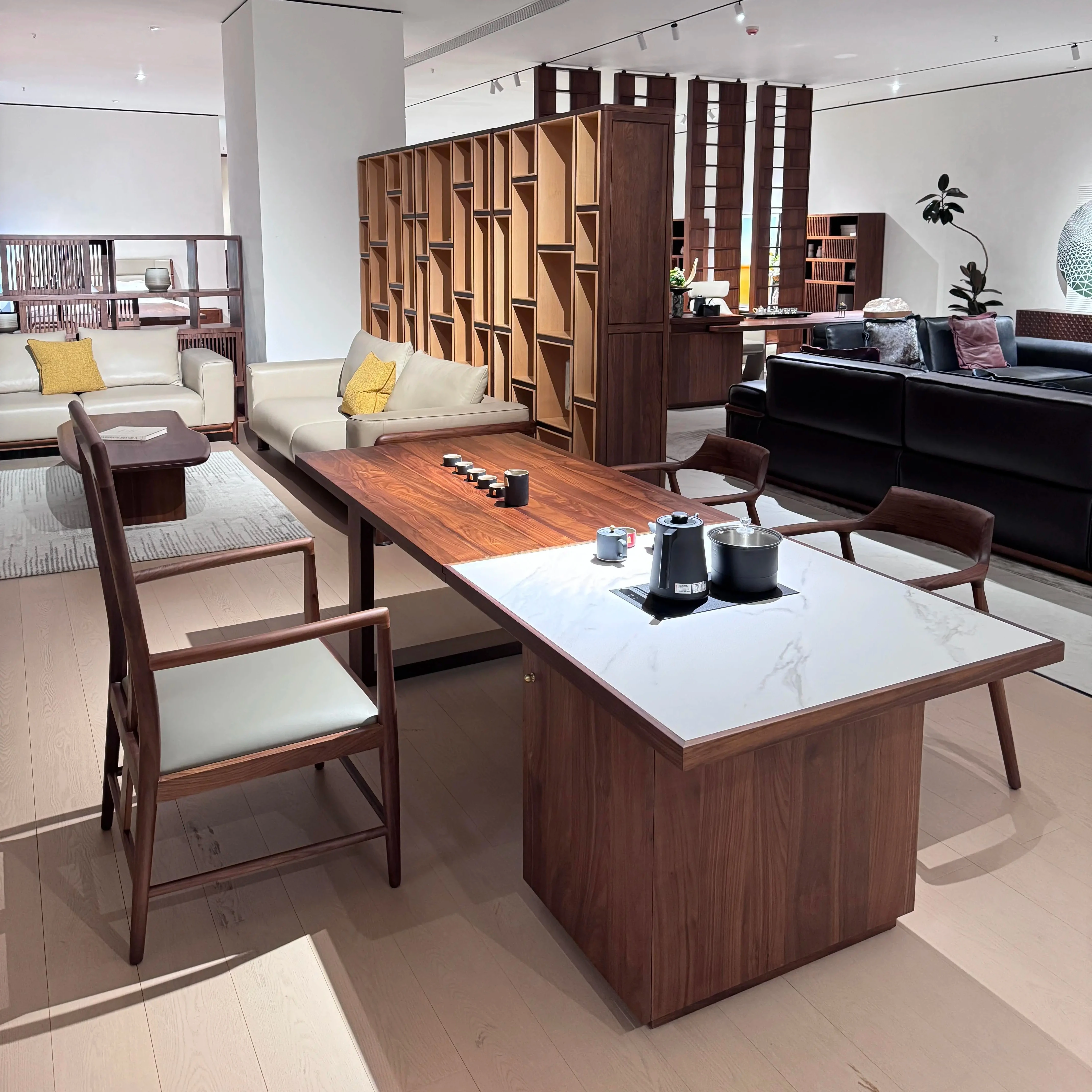 2025年新作!新中式岩板茶桌 - モダンでシンプルなデザイン、ナチュラルなウォールナット材使用。リビングにぴったりな、家族や友人とのお茶の時間を彩る茶台です。