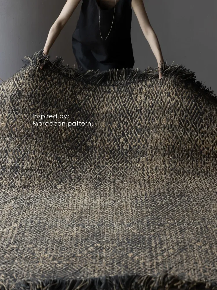 若奈ラグ モロッコ直輸入!手作りのブラック&イエロー麻フリンジラグ 両面使用可能なベッドサイドマット 茶道の美しさを感じる侘び寂びスタイル