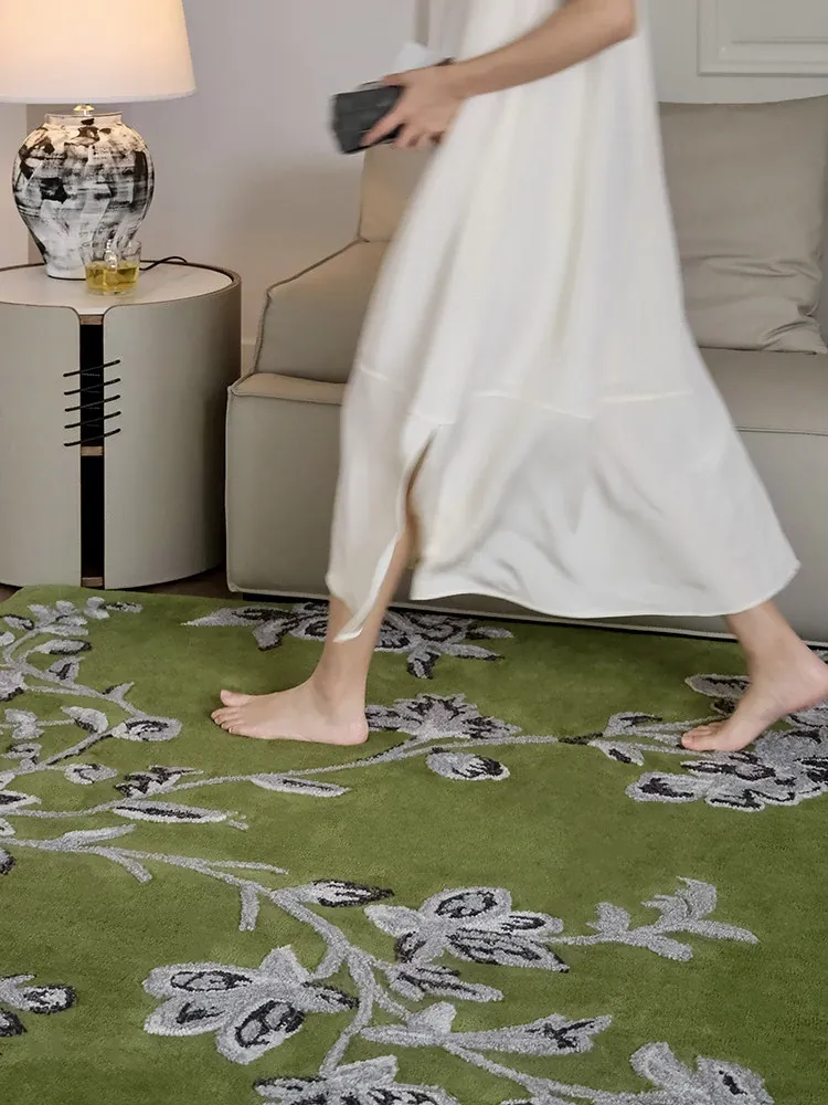 若奈の新色コレクション!立体刺繍手作りラグ《繁盛》独占モスグリーン、リビングソファにぴったりのアイテム!