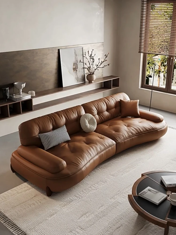 レトロスタイル本革ソファー|高級トップグレイン牛革使用|イタリアンミニマルデザイン|シンプルでスタイリッシュなリビングに最適|コンパクトサイズでも広々としたアーチ型シルエット!